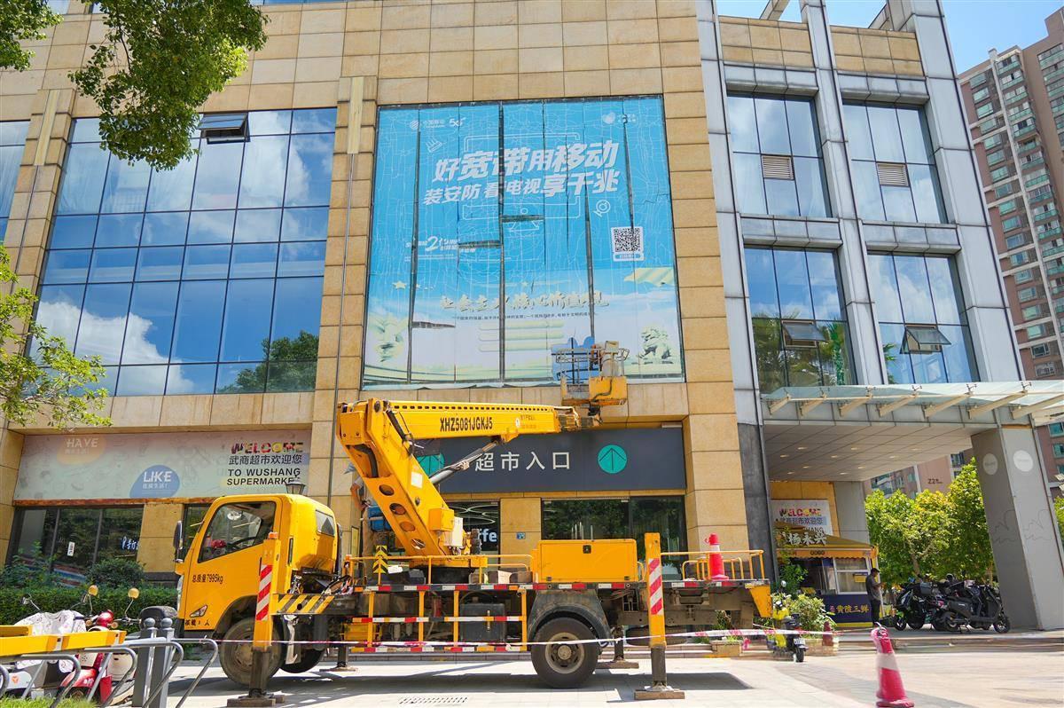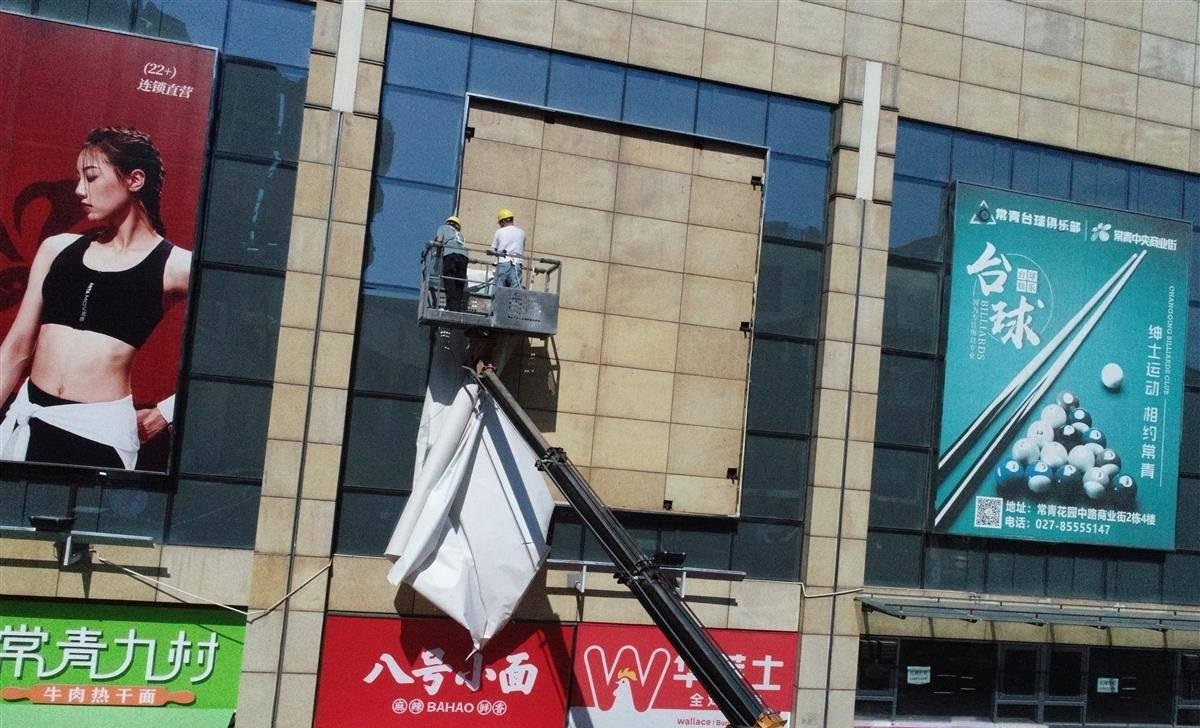 “存在安全隐患的广告,坚决依法拆除,绝不姑息!”8月19日上午,在常青花园中央商业街武商量贩门前,91论坛 城管执法局市政科相关负责人介绍说。在现场,施工人员正搭乘高空作业车,对武商量贩店外立面的问题广告进行一一拆除。