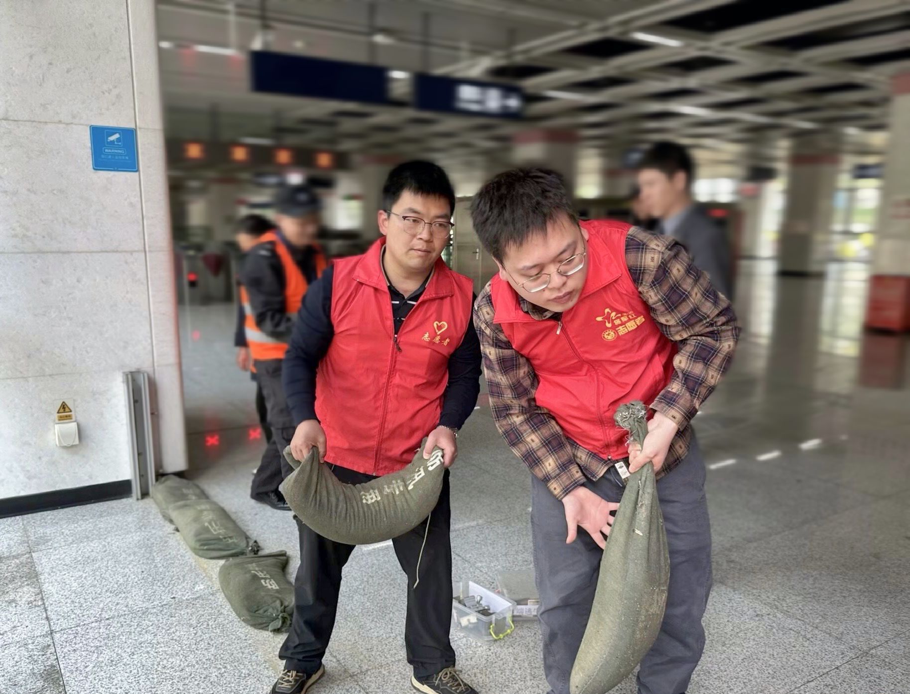 “暴雨连降,导致地铁口地面水位过高,地铁站点内发生雨水倾灌,目前出现险情。各单位立即按照防汛预案开展应急处置。”地铁广播防汛信号发出后,演练人员立即拉开警戒线,地铁站防汛队员和社区志愿者各司其职,各自奔赴防汛物资点搬运沙袋和防洪器材,利用抢险机械设备对重点部位进行封堵、引流等。救护组和消防组则迅速引导受困群众撤离到安全地带。