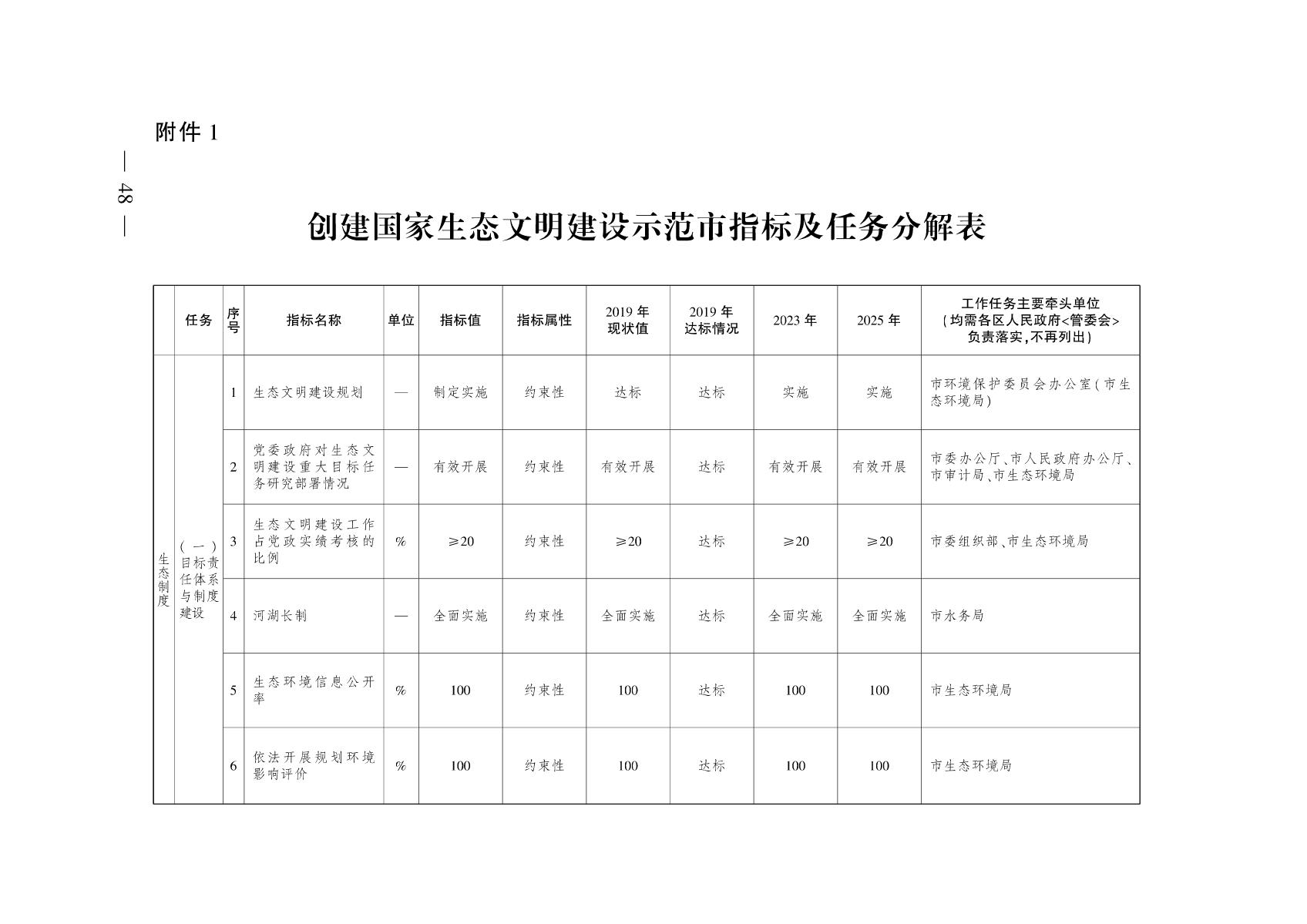 一、紧扣一条主线,坚持对标创建。以国家生态文明建设示范市考核指标为主线,按照国家生态文明建设示范区管理规程确定的创建指标和副省级城市生态文明示范创建的具体要求,制定各区、各部门任务分解表(见附件1),明确时间表和路线图,到2025年全面达到国家生态文明建设示范市考核要求。