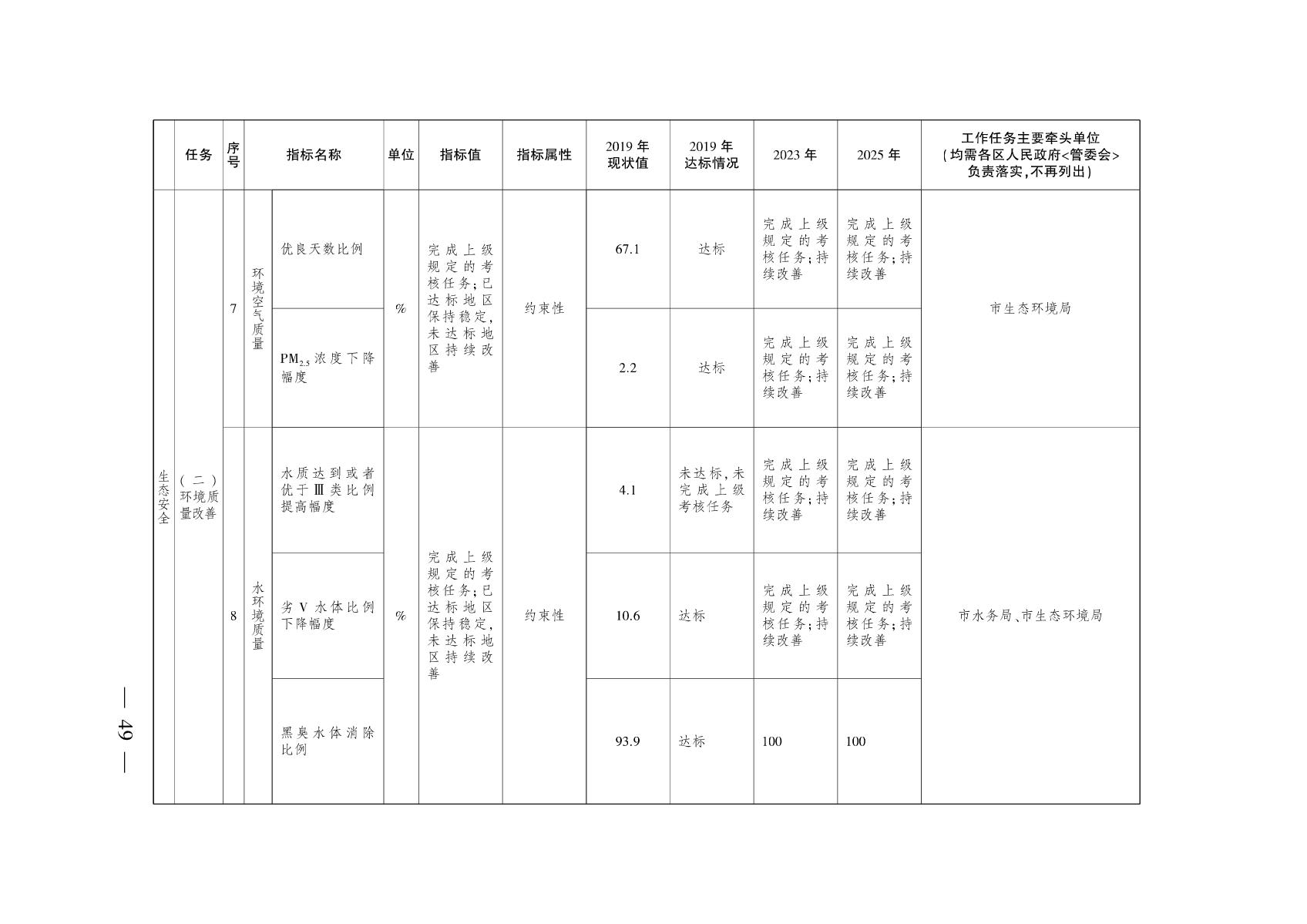 二、环境质量持续稳步提升。突出生态环境问题基本得到解决,天蓝地绿水清的生态环境得以重现。到2025年,空气质量优良天数比例持续提高、水质达到或者优于III类比例持续提高,PM2.5浓度、劣V类水体比例持续下降,并完成上级的各项考核任务。