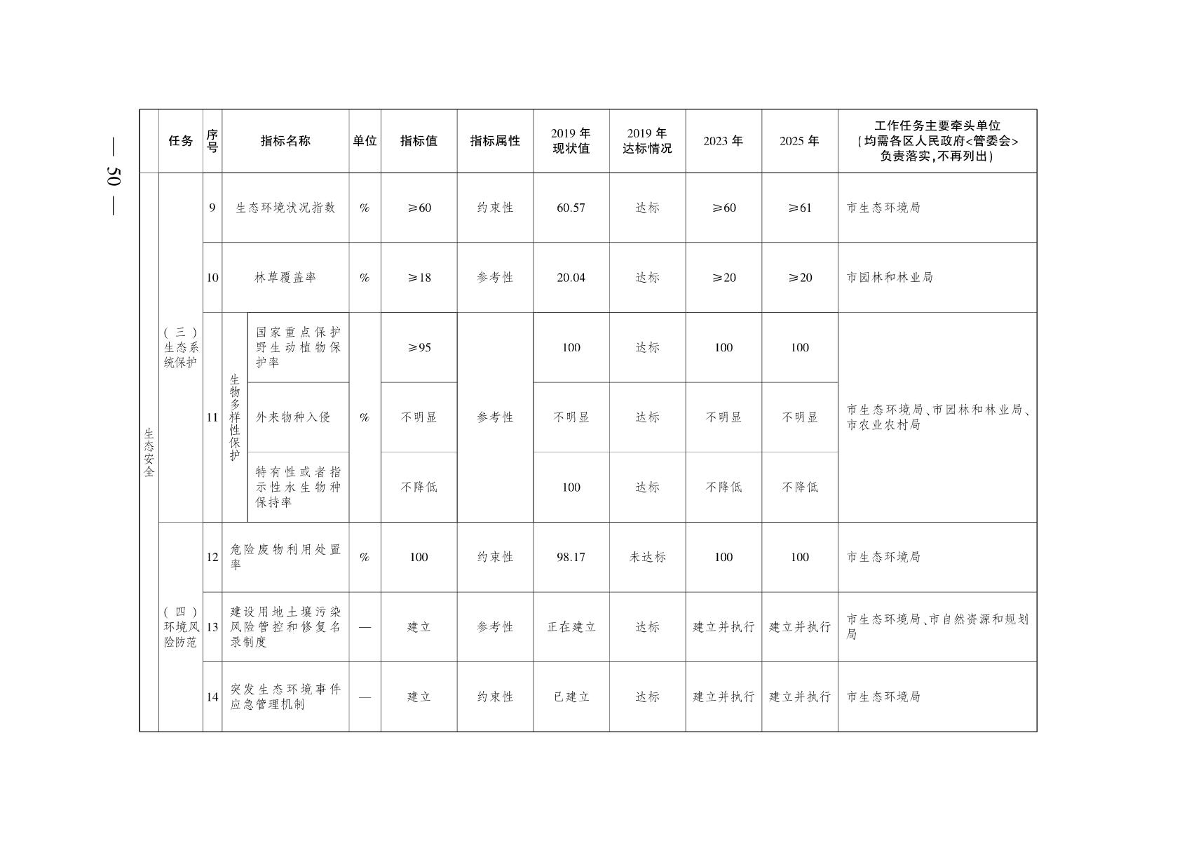 一、生态机制体制不断完善。推动生态环境治理能力和治理体系建设取得积极进展,生态文明制度体系改革不断深入。到2025年,生态文明建设工作占党政实绩考核的比例在20%以上,河湖长制全面实施,生态环境信息公开率稳定保持在100%,全面实施生态文明建设目标责任制,规划环评执行率稳定在100%,形成导向清晰、决策科学、执行有力、激励有效、多元参与、良性互动的环境治理体系。