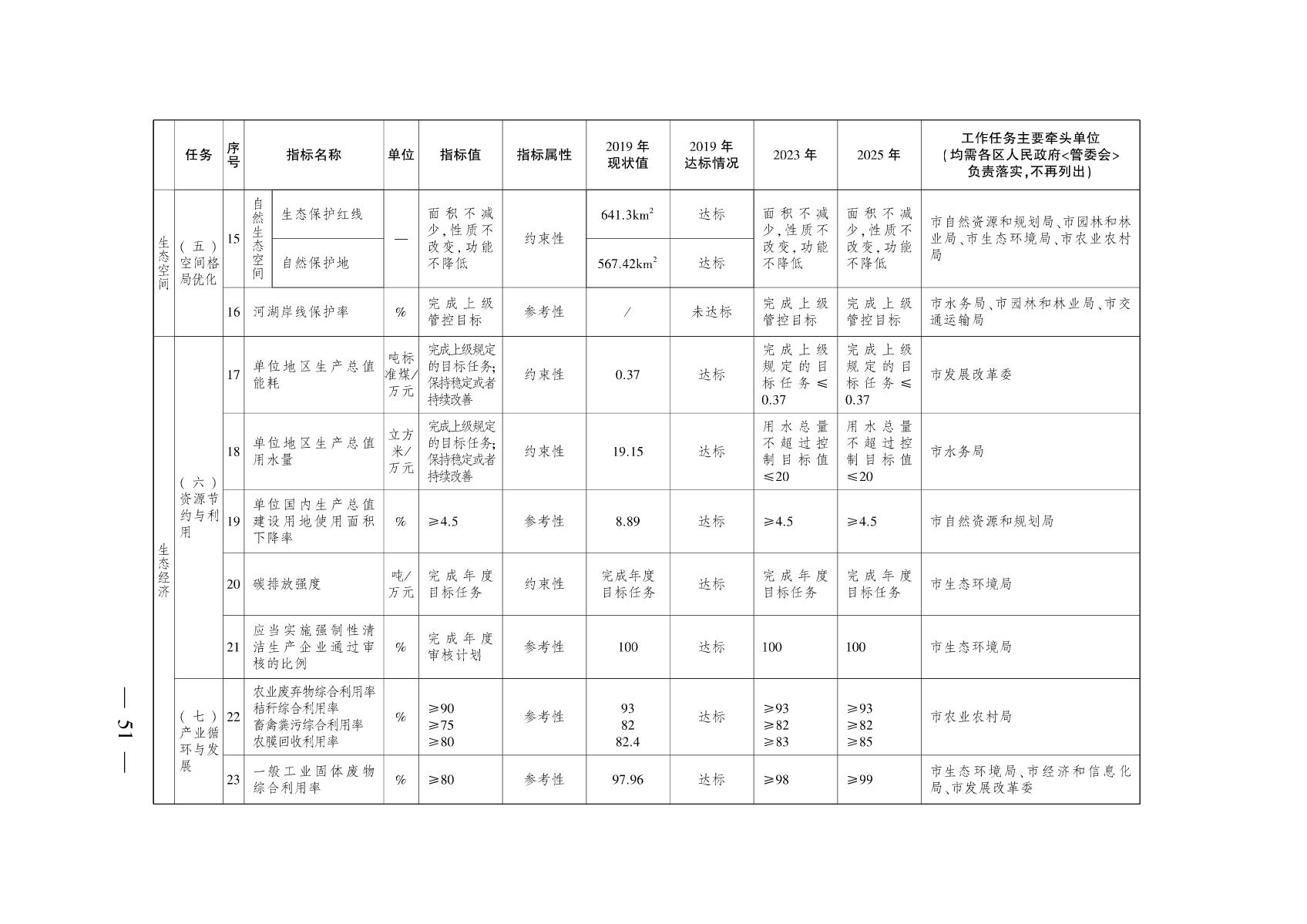 四、生态经济模式持续优化。形成清洁高效的产业布局和产业结构,绿色技术创新能力显著增强,经济发展质量和效益显著提高。到2025年,单位国内生产总值建设用地使用面积年度下降率在4.5%以上,万元GDP水耗、能耗持续达到考核要求,一般工业固体废物综合利用率达到99%。