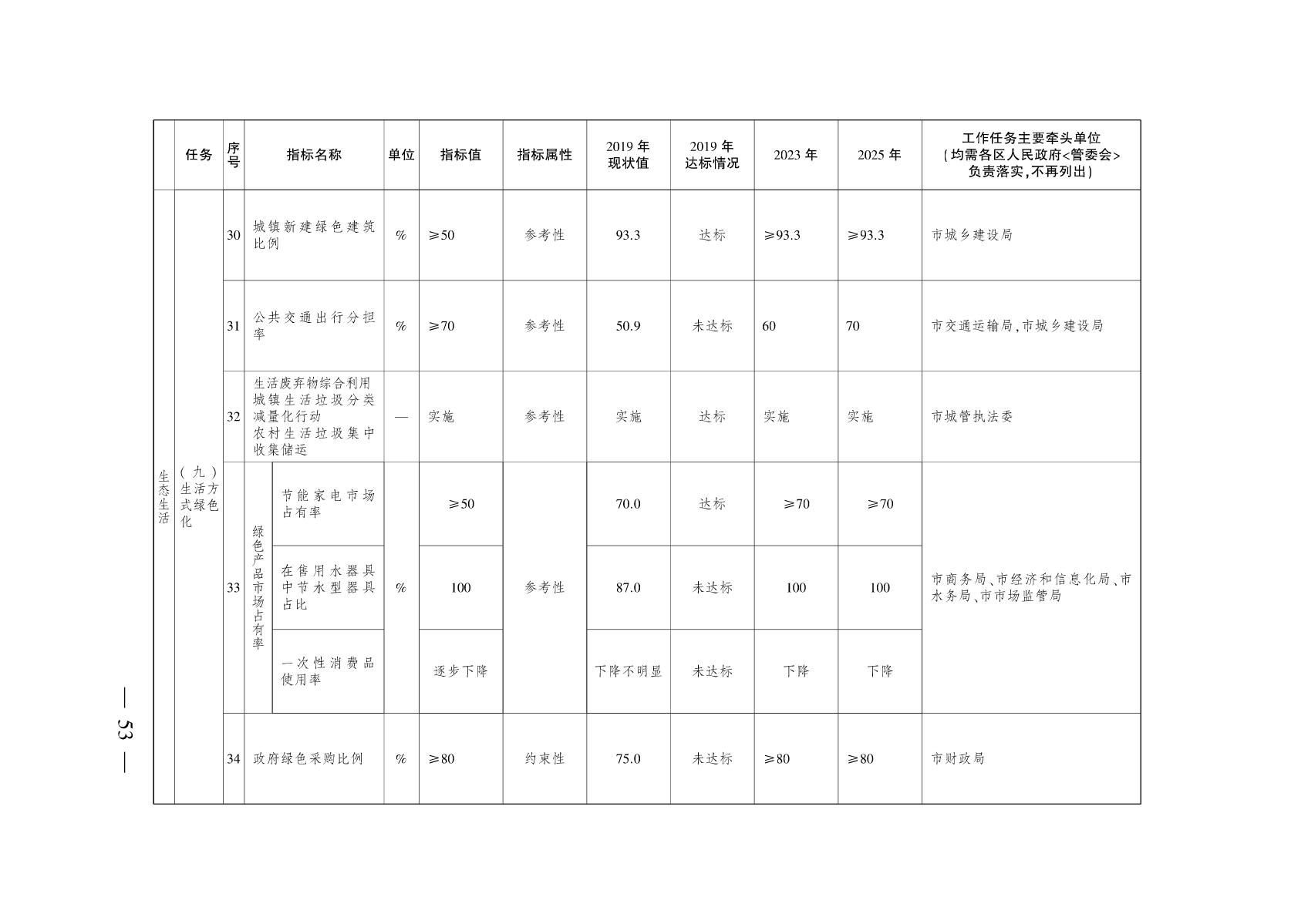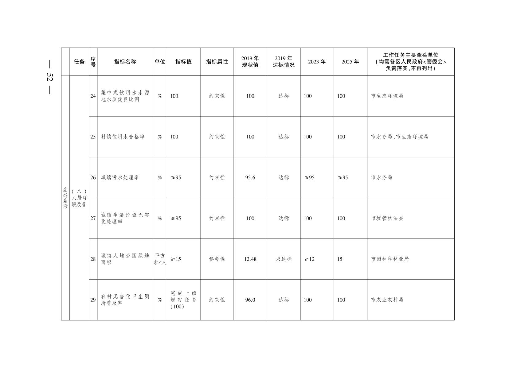 五、生态生活方式全面推广。人居环境持续改善,绿色、环保、节约的文明消费模式和生活方式得到普遍推行。到2025年,城镇生活污水集中处理率达到95%以上,城镇生活垃圾无害化处理率达到100%,城镇新建绿色建筑比例达到93%以上,公共交通出行分担率达到70%,城镇人均公园绿地面积达到15平方米/人。