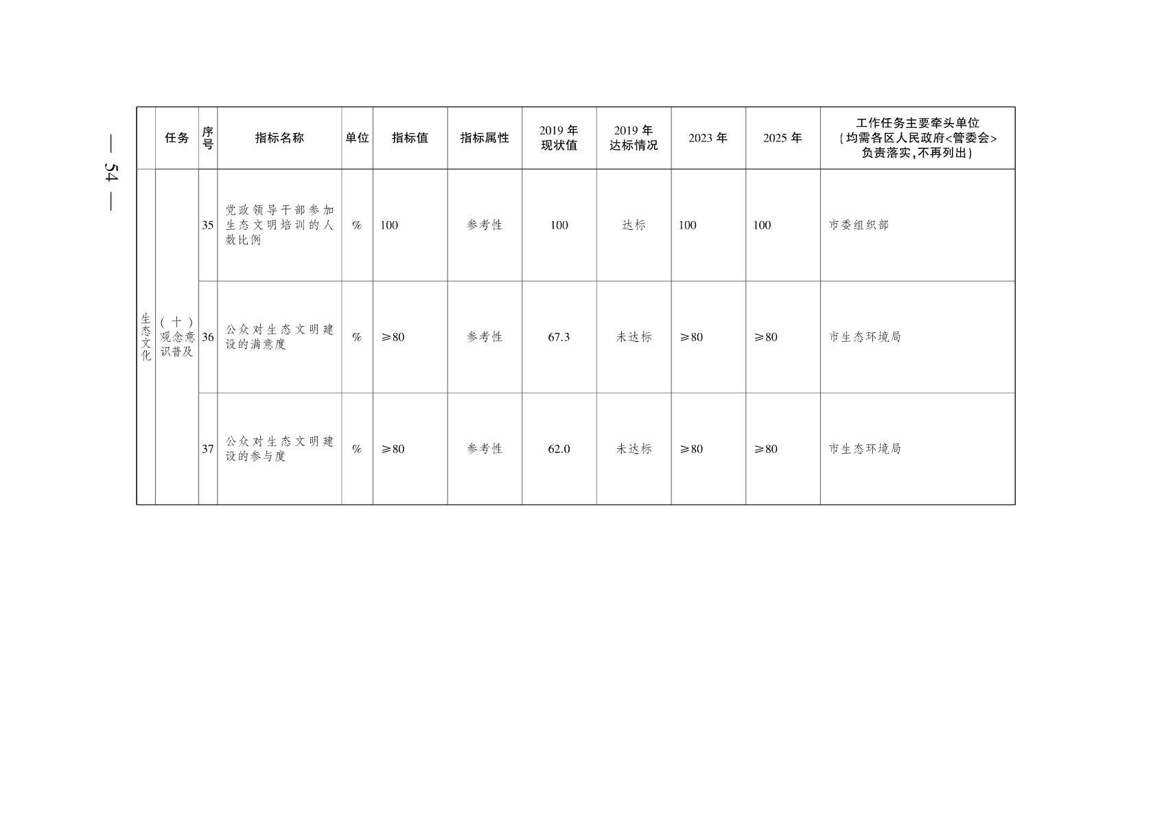 六、生态文化理念深植人心。通过政府、企业、社会组织等多种方式培育具有本地特色、时代特征的生态文化宣传教育体系。到2025年,党政领导干部参加生态文明培训的人数比例持续达到100%,公众对生态文明建设的满意度和参与度均达到80%以上。