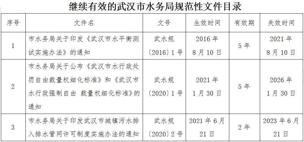 截至2021年7月30日,我局制发的规范性文件中:3件继续有效(其中1件2021年8月10日失效)(详见附表),2件失效,另有1件待生效(《市水务局关于重新公布《武汉市水平衡测试实施办法》的通知》自2021年8月10日起施行)。