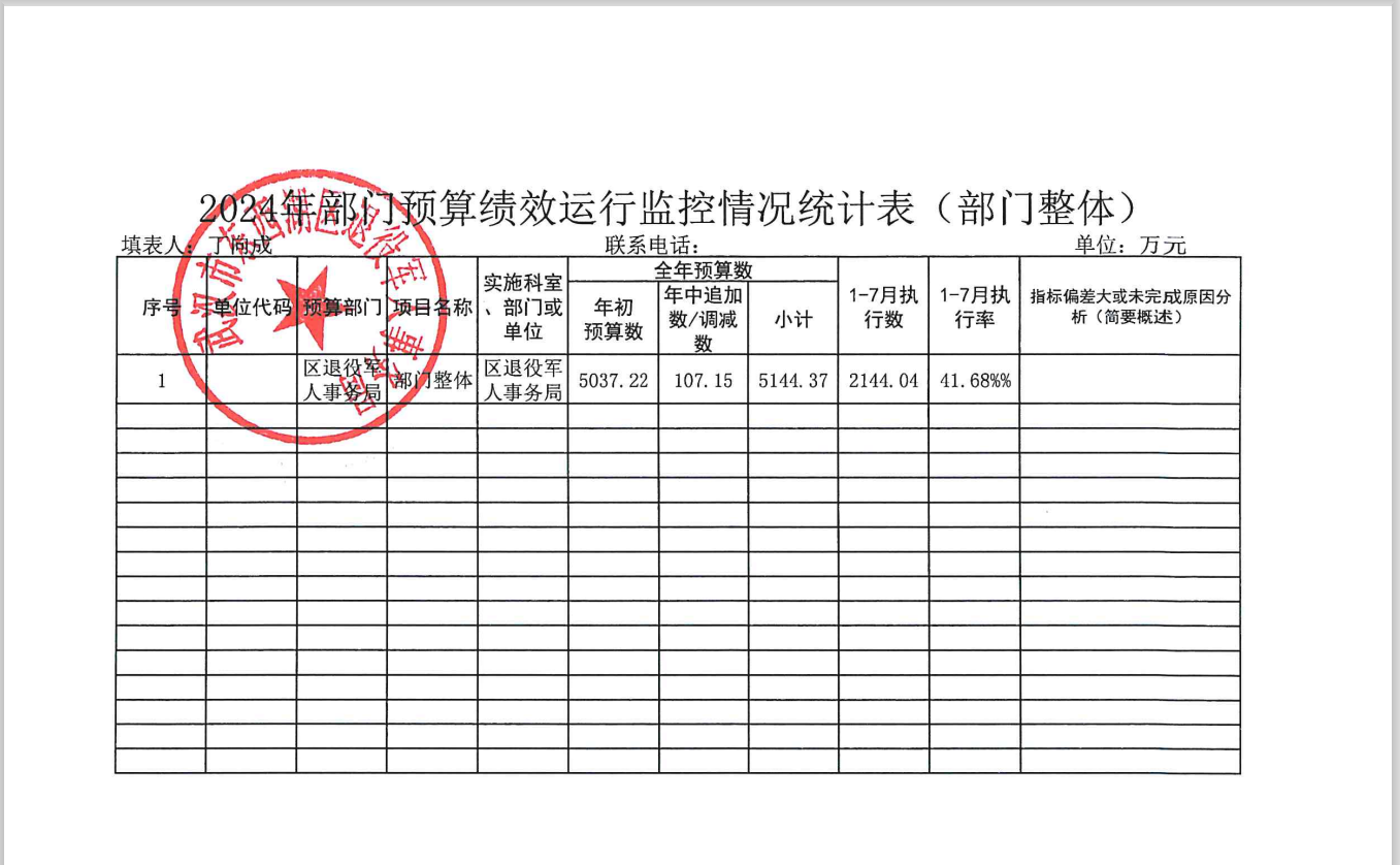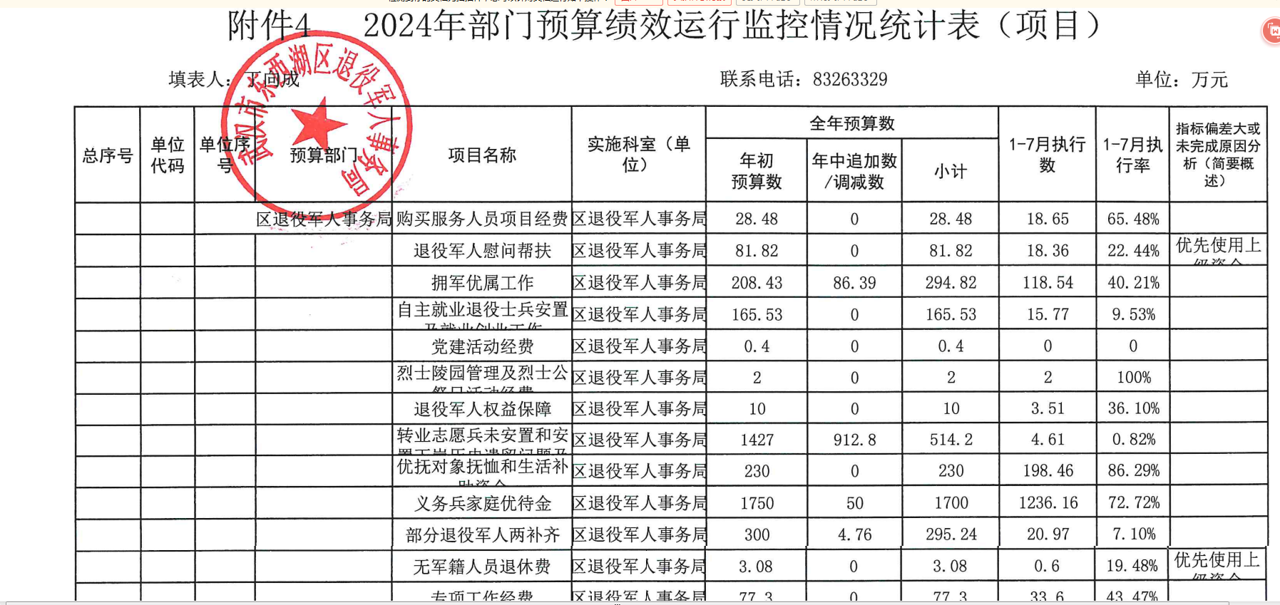 区退役军人事务局2024年1-7月预算绩效运行监控情况公开
