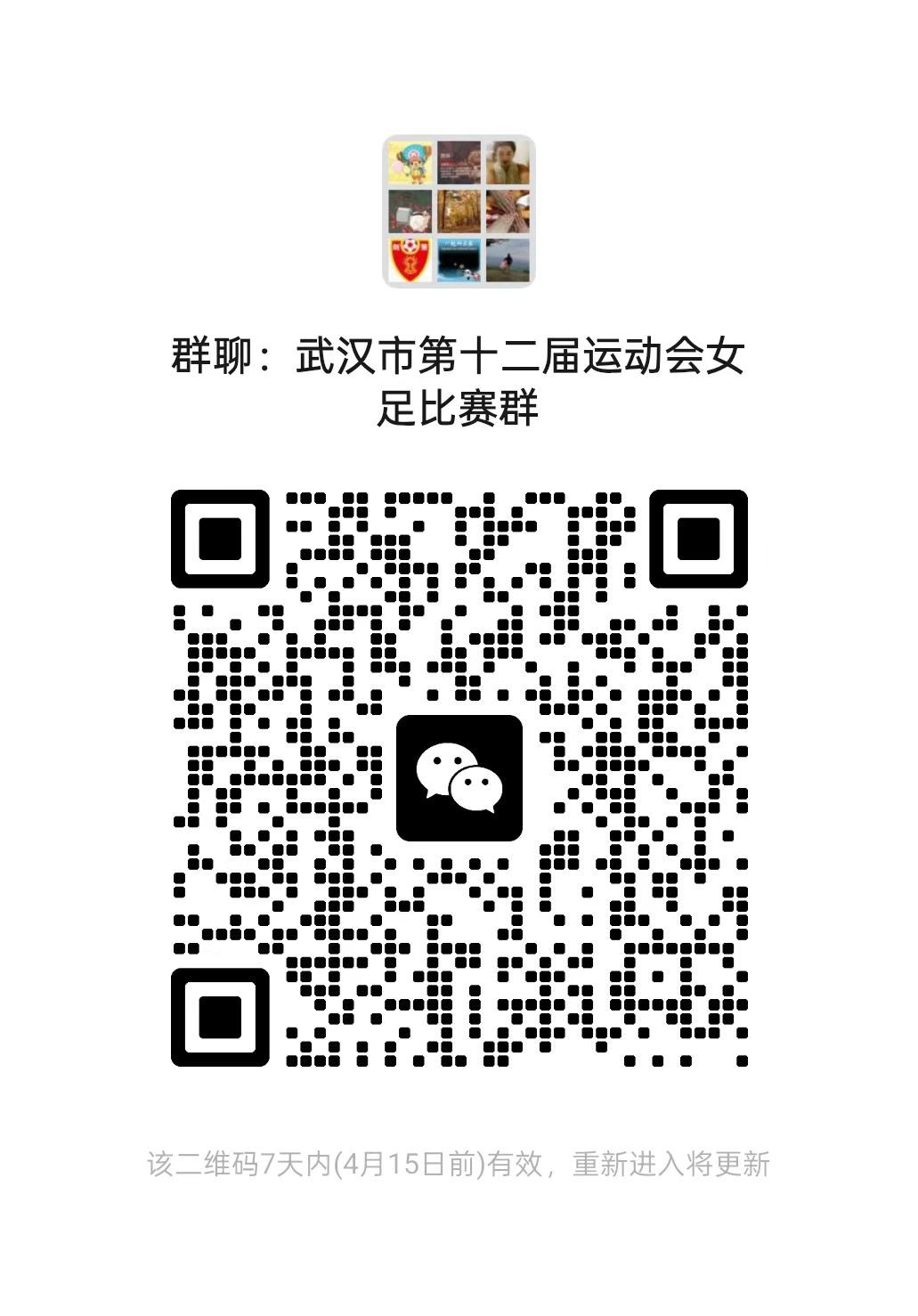 为了方便各区领队、教练员能及时获取比赛过程中的各类信息,本次比赛组建了“武汉市第十二届运动会女足比赛群”微信群,请各参赛单位及时通知相关人员加入该微信群。