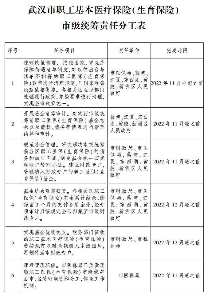 (二)强化责任落实,坚持协同推进。各区、各有关部门要压实工作责任,密切配合,形成合力,确保各项政策措施落实到位(具体分工附后)。各责任单位要结合职能任务和责任分工,进一步细化实施方案,加强沟通协调,严格按照明确的时间节点抓好各项工作落实,确保职工医保市级统筹如期实施。