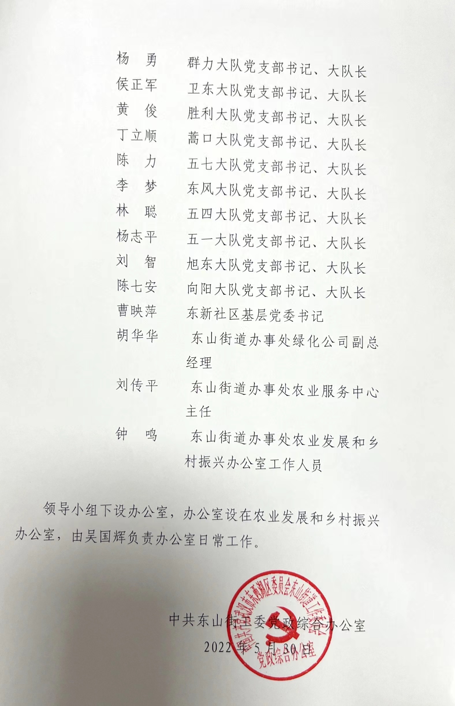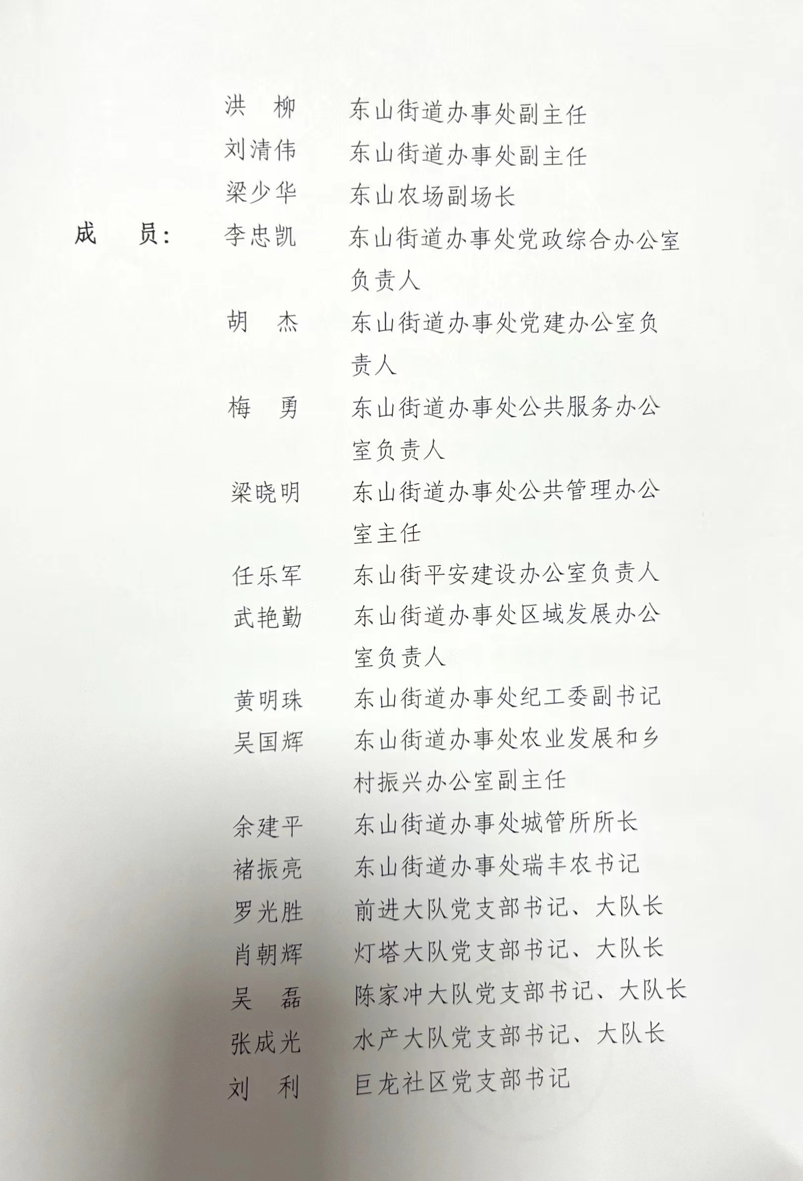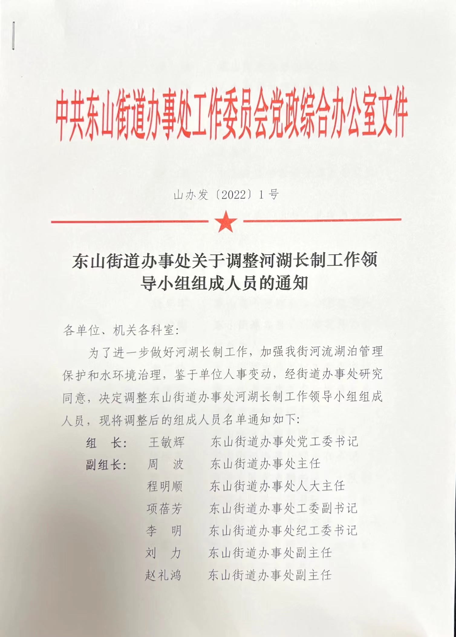 东山街道办事处关于调整河湖长制工作领导小组组成人员的通知